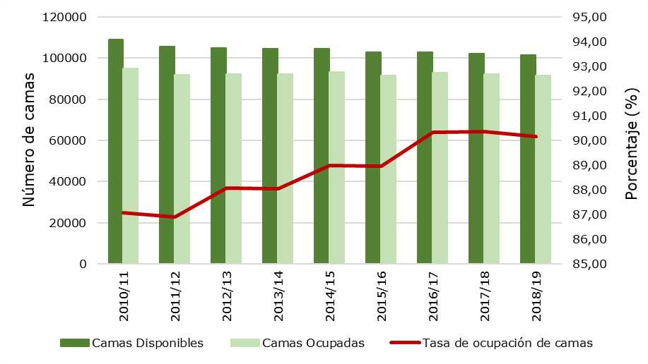 Figura 1. Camas disponibles y ocupadas y tasa de ocupación de camas de pacientes agudos en Inglaterra (2010/11-2018/19)