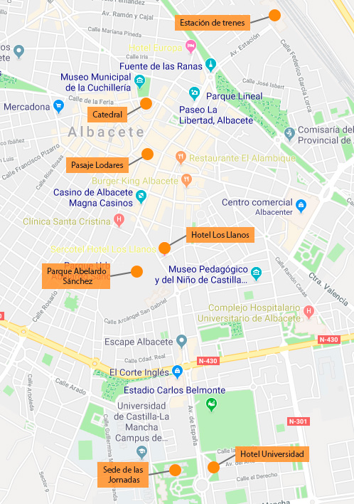 Muchas de las personas que asistáis os alojaréis en el Hotel Universidad (Av. de España, 71) o en el Sercotel Hotel Los Llanos (Av. de España, 9). Ambos están situados en una de las principales avenidas de la ciudad, al final de la cual se encuentra la sede en la que se celebrarán las jornadas, la Facultad de Ciencias Económicas y Empresariales. El Sercotel Hotel Los Llanos está situado a 15 minutos a pie, caminando por la Avenida España. Para ir desde este hotel hasta la Facultad también se puede tomar un autobús, de la línea E (enfrente del hotel), que sale cada 12 minutos, tarda 3 minutos y tiene un precio de 1,20 €. Después hay que caminar 5 minutos. El Hotel Universidad, por otro lado, está a menos de 3 minutos a pie de dicha sede y el Hotel Los Llanos está situado frente al parque Abelardo Sánchez, que es un buen lugar para pasear.