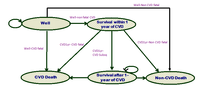 Se ha elaborado el modelo de Markov con cinco estados de salud. El modelo comienza en el estado de salud “sano” (no evento). Al final de cada ciclo y en función del riesgo de tener un evento CV de cada persona, ésta puede pasar al estado de salud de evento CV (primer año), muerte por evento CV, o muerte por otras causas. El estado tunnel (supervivencia después de primer año de tener un evento CV), ha servido para incluir un mayor riesgo de muerte durante el primer año después de tener un evento CV. La distribución de la población entre varios estados de salud se ha calculado a partir de la probabilidad de transición. El equipo de Cambridge estimó los riesgos de un evento CV para cada una de las seis transiciones destacadas en la Figura 1, en la cohorte de bajo riesgo y en la cohorte de alto riesgo, utilizando los datos del estudio caso-cohorte EPIC-CVD (Figura 1).