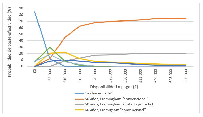 Para las mujeres, la opción más coste-efectiva dado el umbral de £20.000-30.000 por AVAC ganado, es hacer el cribado a los 50 años de edad basado en la FRS “convencional”.