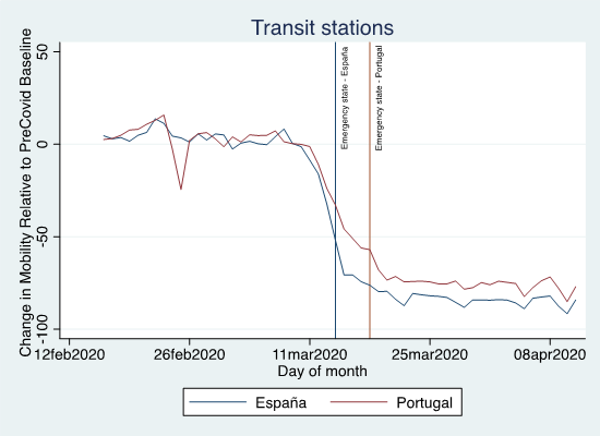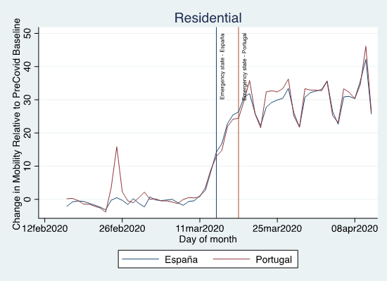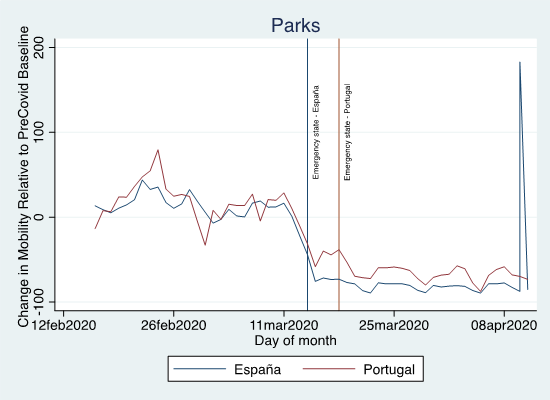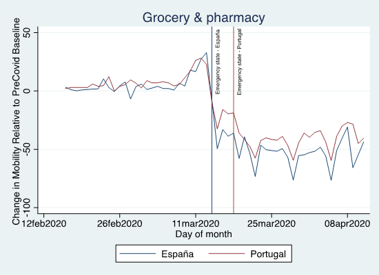Portugal’s advantage was early adoption of measures, relative to the start of COVID-19 cases, not just on how well they were received by the population. Publicly available data from Google Community Mobility Reports (Figure 1) show similar drops in magnitude in the relative mobility of people in Portugal and Spain (albeit slightly deeper in the latter), but it occurred several days earlier in Portugal relative to the start of the lockdown. Thus, I advance the conjecture that early decisions by public authorities and by the population were a demand-side effect that favoured Portugal.
