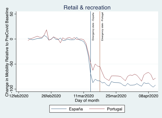 Figure 1 Changes in mobility in Portugal and Spain by type of activity/location