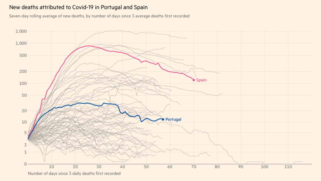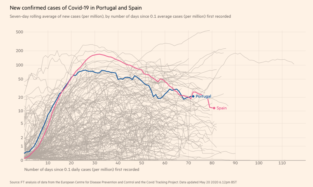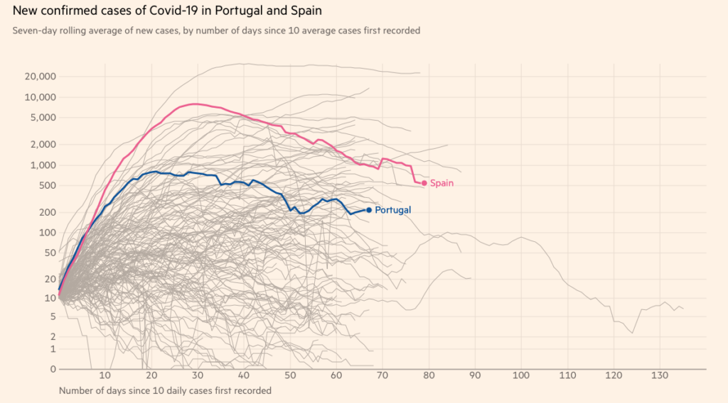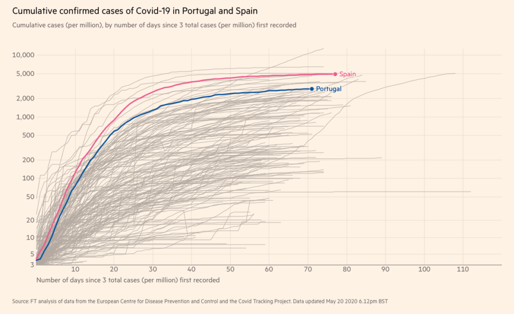 From these pictures, the situation in the two countries is not that different at start, and in per capita terms, the number of cases even looked more problematic in Portugal, despite its NHS hospitals not facing major congestion levels, unlike what was reported in some Spanish hospitals (where the problems caused by COVID-19 patients were further compounded by infection of health care professionals).