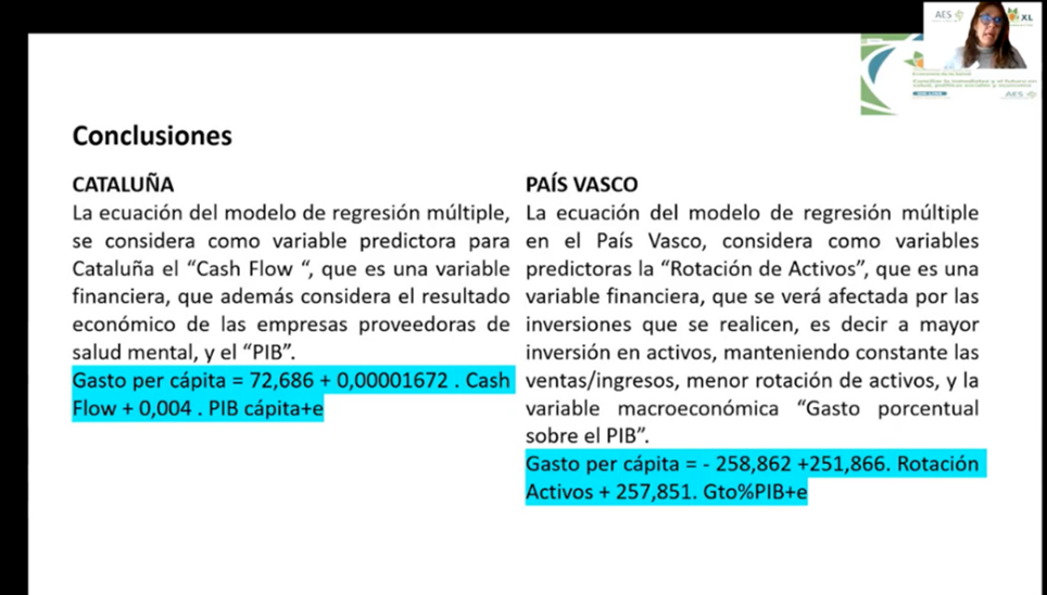 Comienza con la sesión de comunicaciones Elena Puerto, quien nos presentó su trabajo (realizado en conjunto con Jorge Galiana Richart, Fernando López-Muñoz, Paola Mastrantonio Ramos y Alfredo Rocafort Nicolau) con en el que se busca conocer si las variables macroeconómicas (como el producto interior bruto, PIB) son independientes de las variables asistenciales en un contexto de sanidad pública. En su artículo se utilizaron dos bases de datos para dos comunidades autónomas (CCAA), Cataluña (datos del CatSalut) y el País Vasco (datos de los presupuestos generales del Gobierno Vasco). Para ambas CCAA se dispuso de variables económicas y financieras de sus centros de salud. En ambos casos, el horizonte temporal tomado fue de 2006 a 2017. Con el fin de responder a la hipótesis planteada, los autores realizaron un análisis descriptivo, seguido de un contraste de hipótesis. Con respecto a los principales resultados globales obtenidos a partir del análisis descriptivo, se encontró que el 75% de la población que sufre de salud mental no estaba recibiendo el tratamiento adecuado, observándose costes elevados derivados del sistema sanitario, y no sólo económicos, sino también emocionales o relacionados con la carga familiar. El contraste de hipótesis encontró que el gasto sanitario se explica por el PIB. Concretamente, en épocas de contracción económica, el gasto se reduce, los servicios prestados se reducen, y empeora la salud mental de la población. En cuanto a los resultados para cada comunidad, se observaron diferencias entre las dos comunidades. Por un lado, en Cataluña, el gasto sanitario en salud mental fue menor (1314,72€ por habitante) que en el País Vasco (1575,46€ por habitante) tras la pandemia. Además, en ambos casos se redujo. Sin embargo, en cuanto a su distribución, fue más igualitaria en Cataluña, mientras que en el País Vasco se observaron más diferencias en términos de desigualdades en los niveles de gasto por paciente. El estudio (que además es el primero que relaciona el gasto en sanidad con el PIB incluyendo una comparativa entre CCAA) concluyó que el gasto se redujo en ambas comunidades, con diferencias entre ambas. Esto último no es raro, dado que ambas disponen de sistemas sanitarios muy diferentes.