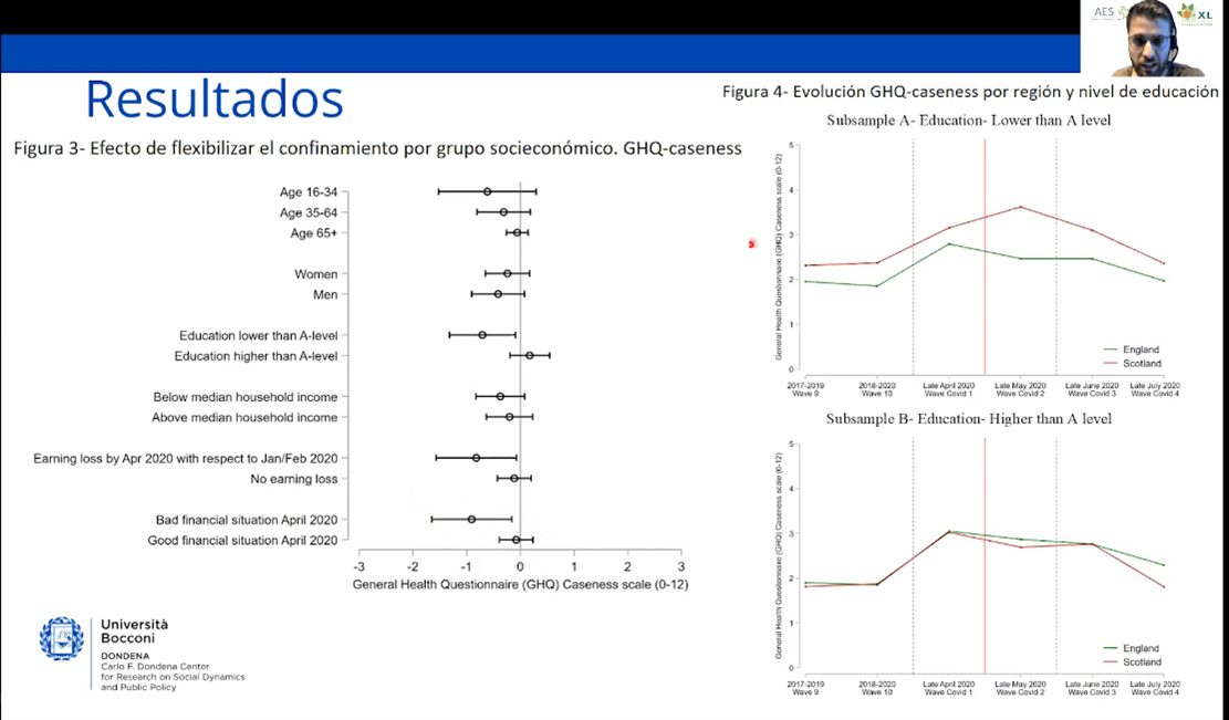En una línea muy similar, a continuación, Manuel Serrano-Alarcón presentó su trabajo (en conjunto con David Stuckler y Alexander Kentikelenis) sobre la salud mental, también en tiempos de la pandemia de la COVID-19. El objetivo de este trabajo era buscar el efecto causal entre el confinamiento estricto y la salud mental. Los datos, en este caso, responden a dos países de Reino Unido: Inglaterra y Escocia. Utilizando datos de 9,000 individuos, e información 2-3 años antes de la pandemia, y durante la pandemia, se comparan datos del instrumento General Health Questionnaire (GHQ)-12, que es un instrumento que está validado para medir el nivel de problemas (auto reportados) de salud mental. Manuel encuentra que la salud mental mejora con el fin del confinamiento en los dos países, y especialmente cuando se quita el confinamiento estricto, aunque se mantengan restricciones importantes de distanciamiento social. Además, el estudio demuestra que existieron efectos especialmente negativos del confinamiento sobre la salud mental en aquellos grupos con niveles más bajos de educación y peores condiciones de estatus social más bajo (concretamente observando un efecto desproporcional en el caso de Escocia). La comunicación termina con una serie de propuestas de políticas públicas, sugiriendo que en los casos en los que sea necesario imponer medidas de confinamiento más estrictas, sería importante tomar medidas de carácter social y de atención a la salud mental, y que éstas deberían ser destinadas especialmente a los grupos de población más desfavorecidos y vulnerables, y con peores niveles de salud mental.