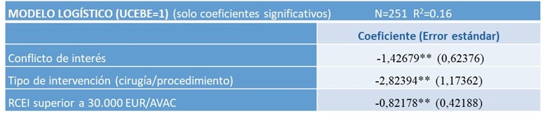 De las estimaciones econométricas, los principales factores que han influido de manera negativa en el uso de los UCEBE son la presencia de conflicto de interés de los autores y encontrar Ratios de Coste Efectividad Incremental (RCEI) superiores a 30.000 euros/AVAC en los estudios.