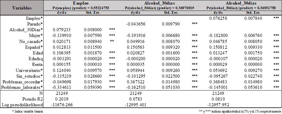 Una vez que estimamos los modelos econométricos, podemos concluir que los efectos de las variables son bastante relevantes: Aquellos encuestados que son consumidores habituales de alcohol son también más empleables, en contra de lo que exponían Johansson, Alho, Kiiskinen y Poikolainen (2007) o Terza (2002) en sus trabajos, donde concluyen que la dependencia del alcohol afecta de forma negativa a la probabilidad de estar empleado tanto para hombres como para mujeres. No obstante, los resultados obtenidos para este trabajo van en línea con algunos artículos que tratan este tema, mencionados anteriormente.