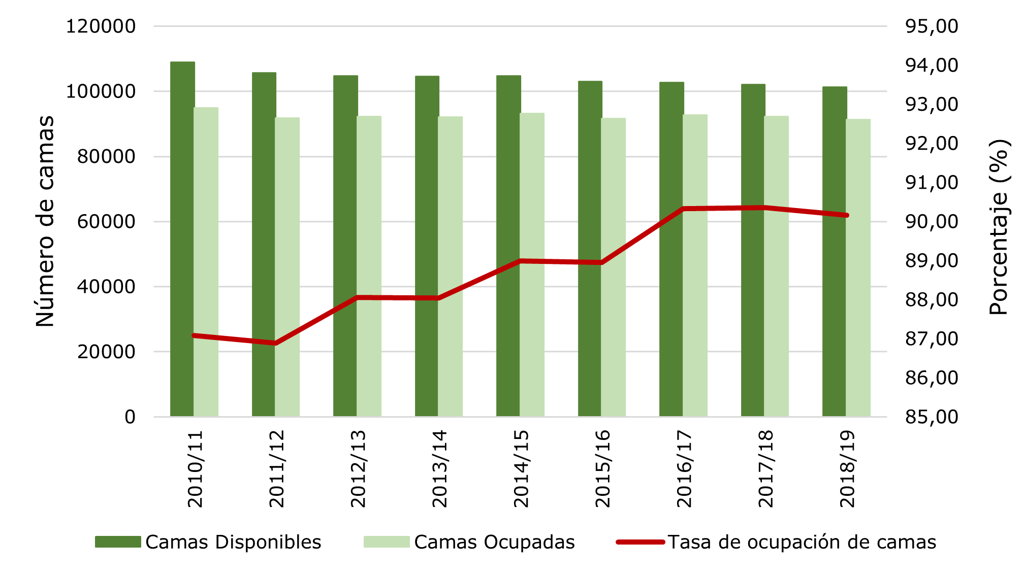 Las altas TOC se deben a varias razones que inciden desde la perspectiva de la oferta y la demanda. Por el lado de la oferta, el número de camas hospitalarias se ha reducido debido al progreso tecnológico, al recorte en gasto público destinado a sanidad y a las estrategias para minimizar los ingresos hospitalarios (OCDE, 2017, 2019). Desde inicios de este siglo, el número de camas per cápita de los países de la OCDE disminuyó de 5,8 por 1.000 habitantes en 2000 a 4,7 en 2017 (OCDE, 2017, 2019). Por el lado de la demanda, la ocupación de camas hospitalarias continúa en aumento como consecuencia de la creciente presencia de enfermedades crónicas entre la población y del envejecimiento demográfico (British Medical Association, 2017).