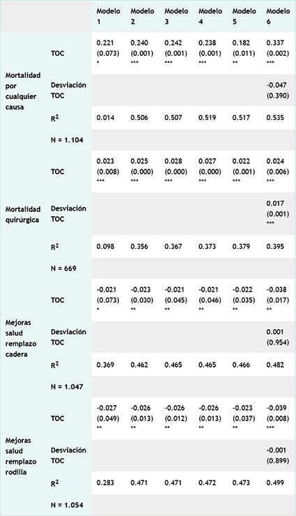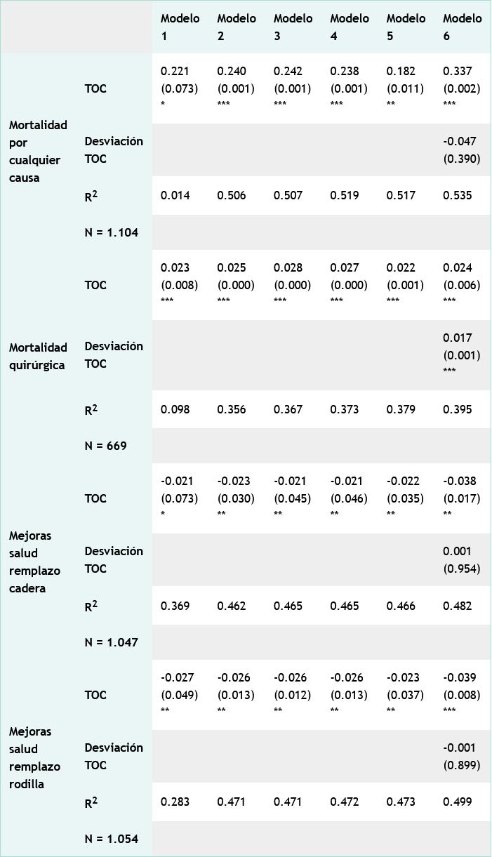 La Tabla 1 presenta los principales resultados del Modelo 1 al 6 (resto de resultados disponibles bajo petición). El Modelo 1 muestra que una mayor TOC está positivamente asociada con un incremento en la mortalidad por cualquier causa y en la mortalidad quirúrgica (mayor mortalidad implica peor calidad), y negativamente asociada con las mejoras en salud después de una operación de prótesis de cadera o rodilla. En términos cuantitativos, un incremento en la TOC de cinco puntos porcentuales está asociado con una reducción en las mejoras en salud de un 0,5%-0,9%, un incremento en la mortalidad por cualquier causa de un 1,1% y un aumento en la mortalidad quirúrgica de un 3,1% (porcentajes calculados respecto a las medias de las variables de calidad).