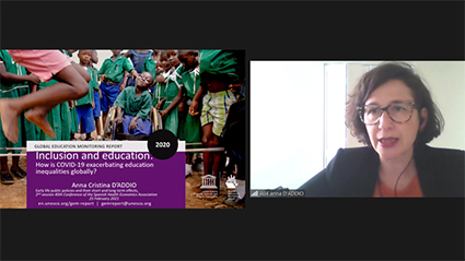 La importancia de mirar a otras políticas nos llevó a la tercera ponente de la tarde. Anna Cristina d’Addio, Senior Policy Analyst en el equipo del Global Education Monitoring Report de la UNESCO, ofreció una panorámica –no muy alentadora- del efecto de la Covid-19 sobre las desigualdades educativas en el mundo.