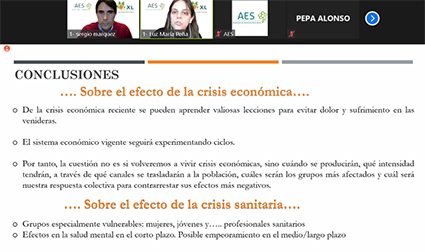 Luz María Peña, Doctora en Economía por la Universidad de Castilla La Mancha, y profesora del Departamento de Análisis Económico, en su ponencia “Crisis y salud mental”, describió los efectos comparados sobre la salud mental de la crisis económica de 2008 y los que estamos observando en la crisis sanitaria actual. Luz explicó el modelo conceptual explicativo de los mecanismos que se dan en las crisis y provocan efectos sobre la población. Un primer mecanismo individual o familiar, principalmente vía mercado de trabajo, y un segundo mecanismo por el efecto presupuestario, basado en la gestión de los recursos, vía recortes en políticas sociales y en el sistema sanitario.