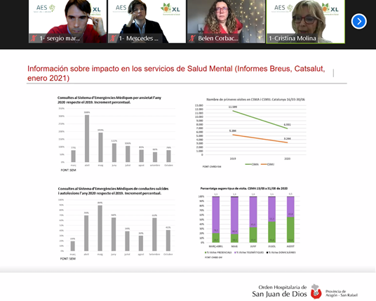 A continuación, la intervención de Cristina Molina, Directora de Análisis y Estrategia de Salud Mental de la Orden Hospitalaria San Juan de Dios (Provincia de Aragón-San Rafael) en la que presentó los retos de la atención a la salud mental bajo la óptica de una organización, recalcó que la salud mental es un problema de salud pública y requiere de un enfoque multisectorial. La magnitud que representan los trastornos mentales y el consumo de sustancias son de los principales problemas que generan más años vividos con discapacidad, tanto en España como en el resto del mundo. Según la OMS, las pérdidas de productividad por depresión y ansiedad cuestan mundialmente hasta 1 billón de dólares cada año, y dicha magnitud se ve agravada por la crisis sanitaria. Por ejemplo, en Cataluña, donde se cuenta con datos relevantes, la crisis sanitaria provocó inicialmente un aumento significativo de consultas por conducta suicida y autolesiones, pero una disminución de las primeras visitas y controles en los centros de salud mental y a las que se ha tenido que dar respuesta con actividad telemática durante el confinamiento. Pero la crisis sanitaria ha impactado de forma clara, pues en esto momentos se está observando un impacto en jóvenes, con aumentos de conductas suicidas y trastornos de comportamiento alimentario.